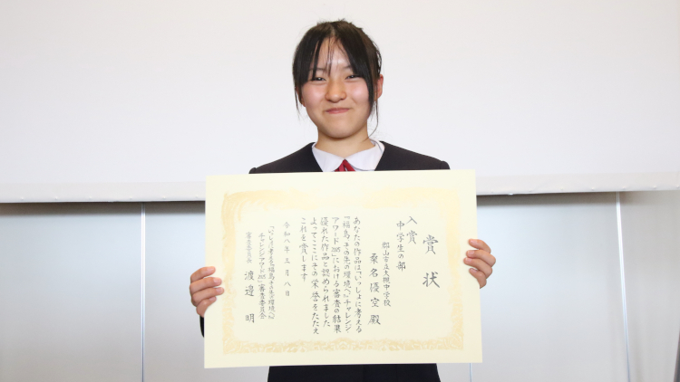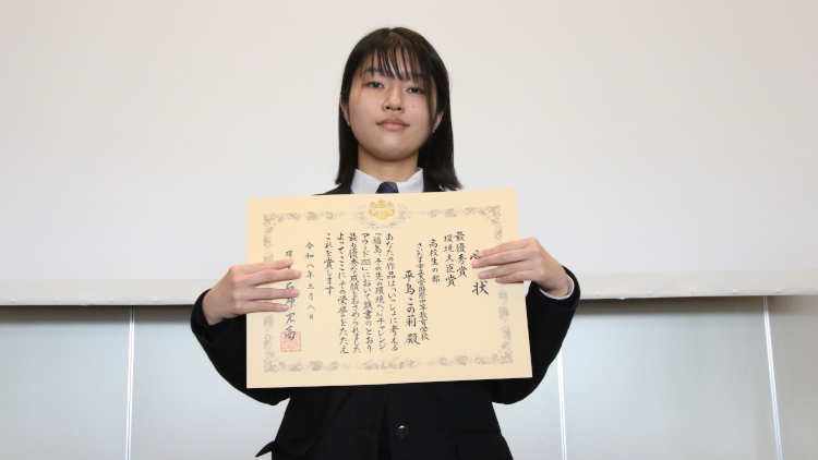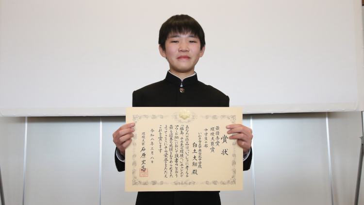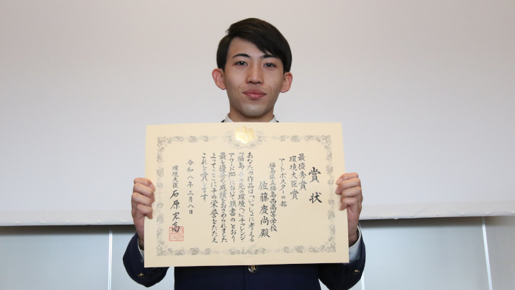 この度は、環境大臣賞という素晴らしい賞を受賞することができ、とても嬉しく思います。私は、東日本大震災を経験しておらず、映像や写真で恐怖だけを知り、その恐怖から身を守るための防災訓練をしてきました。これは、私より下の世代も同じだと思います。今回、楽しく学んで、命を守るという考えを発信させていただきました。この考えが少しでも広がり、自然豊かな福島で生まれたこと、これからも福島で生きていくことに誇りを持ち、震災の教訓から学んでいける仲間が増えることを願っています。