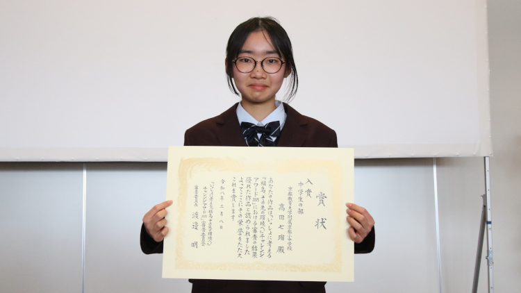 このたびは、このような賞をいただき大変驚いています。私が実現したい、福島の「自然美術館」という思いに共感していただけたことを、心からうれしく思います。幼い頃から身近な自然に親しみ、その魅力を多くの人に知ってもらいたいという思いで、今回の作文を書きました。福島学カレッジ表現コースで、自然とアートを通して思いを共有する楽しさを知ったことが、この作品の原点です。この文章をきっかけに、身近な自然に目を向けてみたいと思ってもらえたら幸いです。将来は、自然や農業に関わり、自然を未来へつなぐ存在になりたいです。